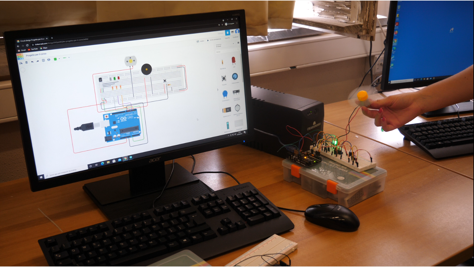 La seconda metà del corso, che comprendeva sia lavoro in aula che da casa, è stata per la maggior parte dedicata allo sviluppo di progetti personali e gli studenti, divisi in coppie, hanno avuto la possibilità di trasformare le proprie idee in un progetto concreto legato alle esigenze e alle problematiche quotidiane. Le idee che hanno preso vita sono le più diverse e creative e, grazie ai kit di programmazione Arduino messi a disposizione per gli studenti, sono stati realizzati, tra i diversi progetti: un allarme mediante la scrittura di un codice e con l’utilizzo di sensori di movimento, un rilevatore di temperatura, una scatola dove riporre lo smartphone per impedirne l’uso dotata di sensore di movimento, un distributore automatico di cibo per animali collegato ad un timer, una sveglia e un mini-pianoforte.